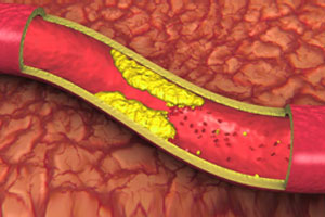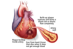 A heart attack (myocardial infarction) results when blood flow is completely blocked, usually by a blood clot forming over a plaque that has ruptured. Unhealthy habits, such as a diet high in cholesterol and other fats, smoking, and lack of exercise accelerate the deposit of fat and calcium within the inner lining of coronary arteries.